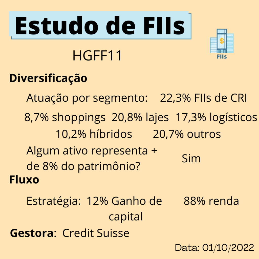 Do mesmo modo que a Credit Suisse faz em fundos de tijolo, os dividendos mensais do HGFF11 são pagos sobre as receitas recorrentes, ou seja, pelos dividendos que ele recebe recorrentemente de outros FIIs. Receitas advindas de ganhos de capital ficam retidos para distribuição no fechamento do semestre.