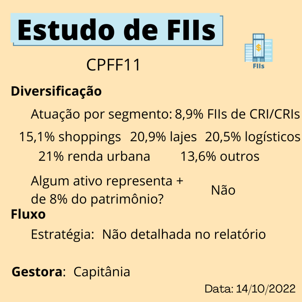 Vale a leitura desse relatório em qualquer momento em que você queira estudar o CPFF11. Afinal, ele é carregado de ideias da gestão, as quais valem para o estudo da mesma. Segue o link para o relatório de agosto de 2022: https://fnet.bmfbovespa.com.br/fnet/publico/exibirDocumento?id=356505&cvm=true
